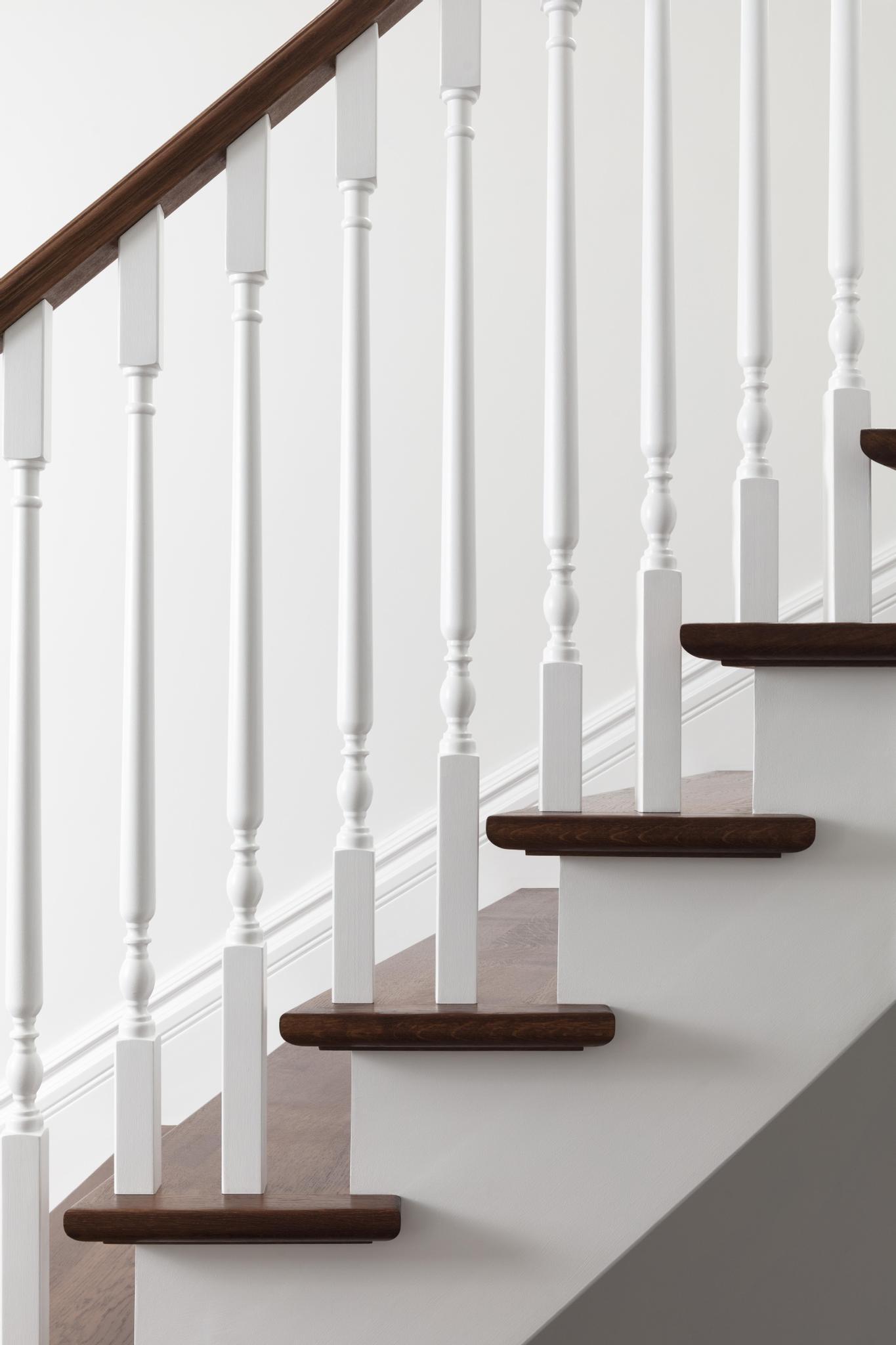 The turned spindles add a refined, classic touch and complement the stained glass window.