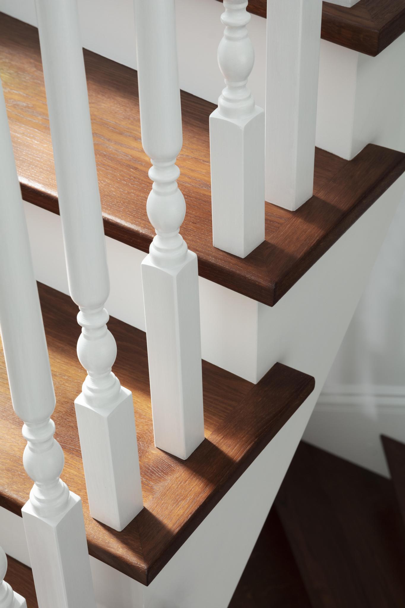 Dark stained French Oak treads and a matching handrail contrast beautifullyl with the crips white risers and spindles.